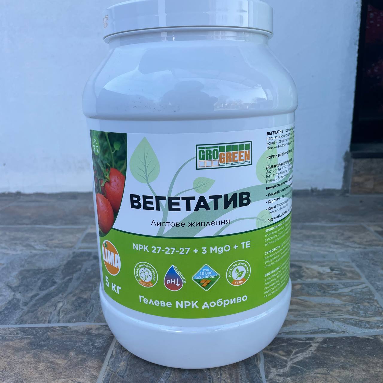 Гель Вегетатив 27-27-27+TE 5 кг (Гро Грін) — це висококонцентроване водорозчинне листкове добриво від компанії GroGreen, що забезпечує збалансоване живлення рослин азотом, фосфором і калієм.
